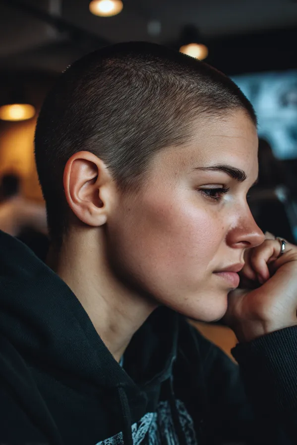 This hairstyle is an ultra short buzz cut with an even length all over and a soft natural texture. The dark tone keeps it grounded and minimal, while the close crop highlights the shape of the head and facial features.
