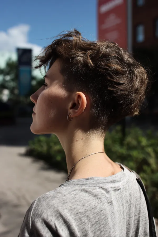 This hairstyle features a short tomboy crop with closely faded sides and back, paired with a slightly longer top that falls forward in soft, natural layers. The muted brown tone keeps it grounded while the textured finish adds a relaxed, effortless feel.
