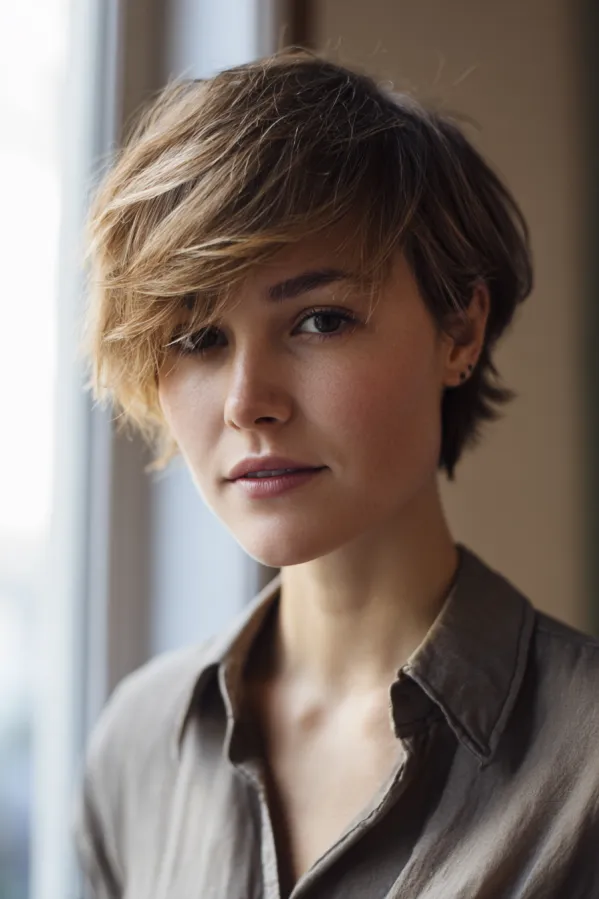 This hairstyle is a short pixie with soft, feathered layers that sweep gently to one side. The warm light brown tones add dimension, while the airy texture and slightly longer top keep the look light and relaxed.