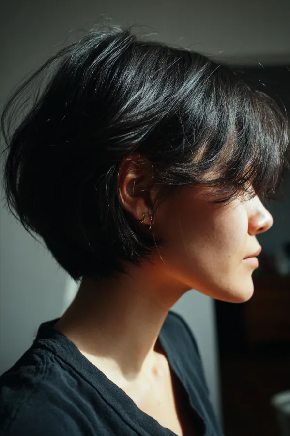 This hairstyle blends a short bob and pixie with a rounded shape and soft, layered volume. The deep black tone keeps it sleek, while the light fringe and tucked ends create a smooth, gentle silhouette around the face.