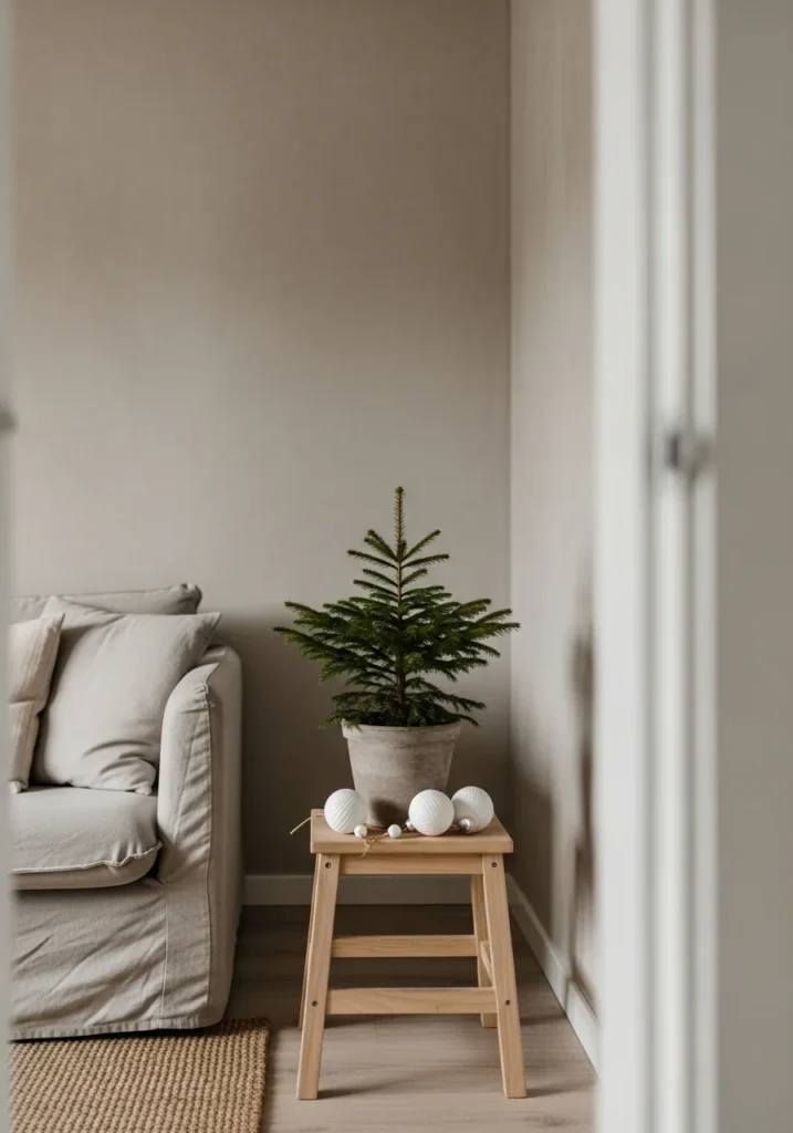This cozy corner shows how simplicity can make the biggest statement. A tiny potted evergreen sits gracefully on a light wooden stool, with just a few neutral ornaments resting nearby. The beige sofa, woven rug, and soft-toned walls keep everything calm and cohesive. It’s proof that a minimalist Christmas tree doesn’t need glitter or grandeur to feel festive.