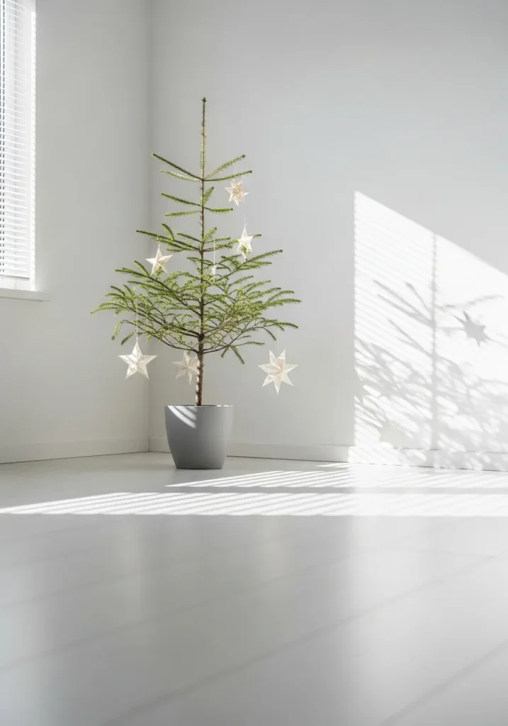 This minimalist setup features a small evergreen tree standing gracefully in a matte gray pot against a bright white wall. The branches are delicately adorned with light paper stars, catching the soft daylight filtering through the blinds and casting dreamy shadows across the floor. Everything about the space feels calm and intentional, from the bare branches to the uncluttered corner that lets the tree’s natural charm shine.