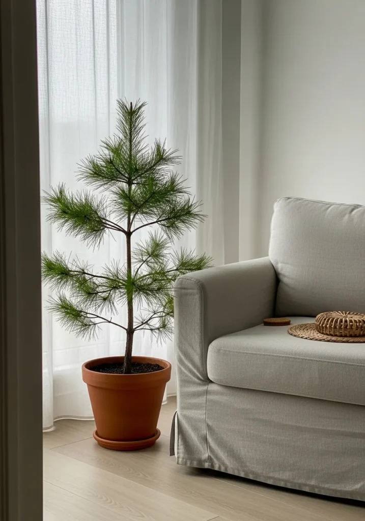 This design captures the essence of calm minimalism with a single potted pine standing gracefully beside a soft neutral sofa. The terracotta pot adds a touch of warmth against the clean white curtains and pale wood floors, making the space feel grounded and effortlessly serene. Natural light filters through sheer drapes, giving the room a soft glow that enhances its understated elegance.