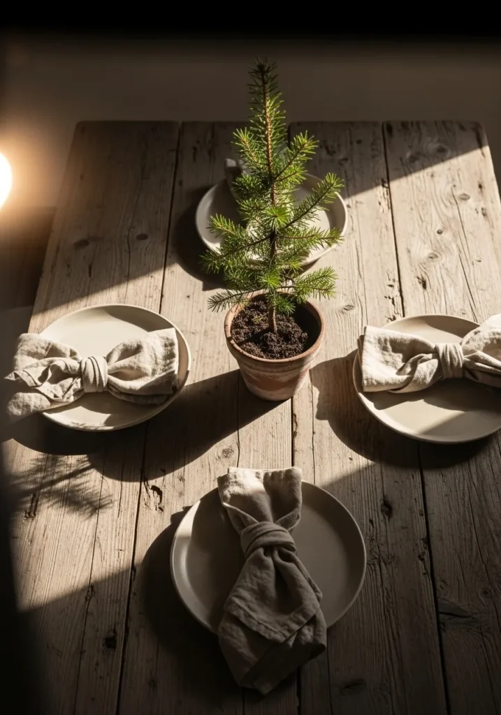 This cozy scene captures a perfectly simple take on Christmas elegance. A small potted pine sits at the center of a weathered wooden table, surrounded by four stone-gray plates, each topped with a knotted linen napkin. The sunlight spills across the textured surface, highlighting every grain of the wood and the soft folds of the fabric. The design feels both humble and refined, creating a peaceful balance between nature and style.