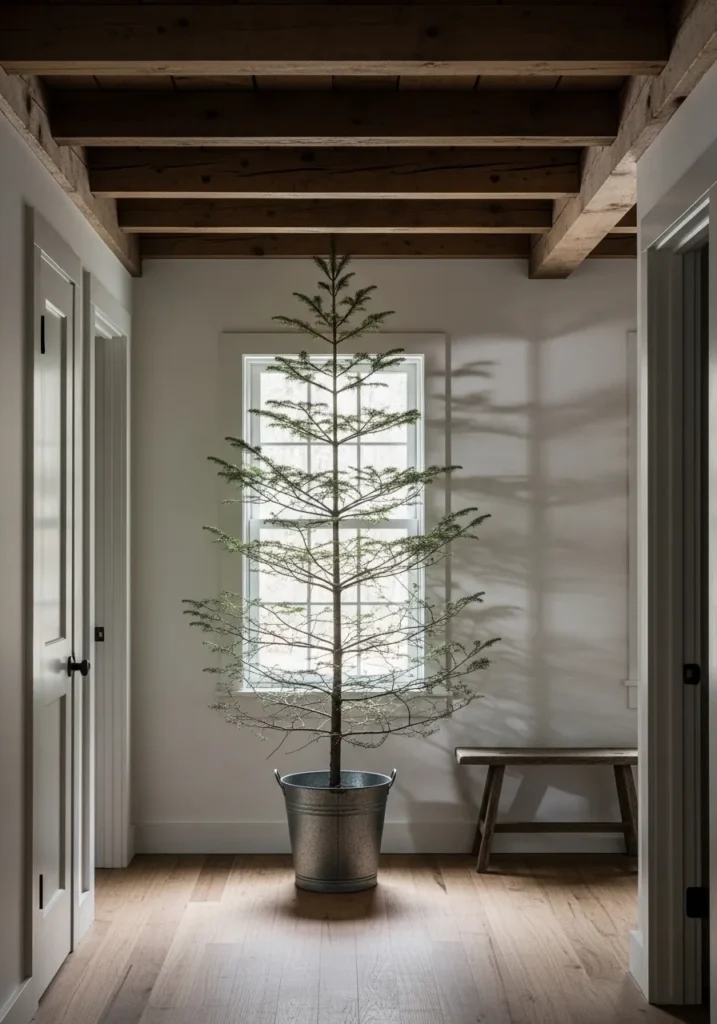 This design proves that simplicity can be completely enchanting. A slender Christmas tree stands gracefully in a galvanized metal bucket, perfectly centered beneath a wooden beam ceiling that adds warmth and texture. The soft natural light from the window highlights every delicate branch, creating a poetic shadow dance on the white walls. With its raw wood floors and rustic bench, the entire space feels intentionally quiet and deeply calming—like a peaceful pause between winter days.