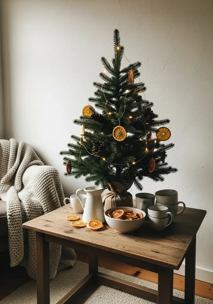 This small Christmas tree feels like the definition of minimalist charm. It’s placed on a rustic wooden coffee table, surrounded by soft textures and neutral tones. The tree itself is simply decorated with dried orange slices, a few pinecones, and delicate string lights that glow softly against the green needles. A chunky knit blanket draped over the sofa adds warmth, while ceramic mugs and a white pitcher on the table create an inviting little winter nook that feels calm and lived in.