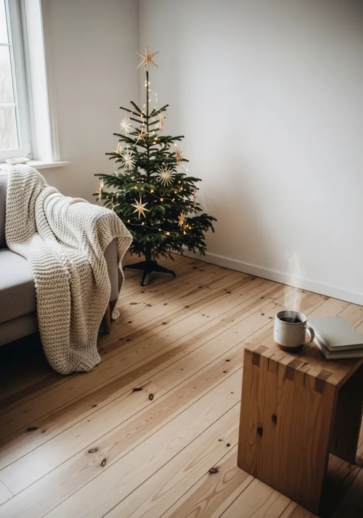 This cozy little corner captures the pure essence of minimalist Christmas charm. A small, natural pine tree stands quietly beside a window, its branches catching the golden light that filters through sheer curtains. There are no ornaments here—just a few subtle fairy lights that bring the perfect touch of warmth. The soft grey sofa, paired with a chunky knitted throw, keeps the space feeling grounded and effortlessly stylish. Everything about this setup whispers calm comfort and understated holiday beauty.