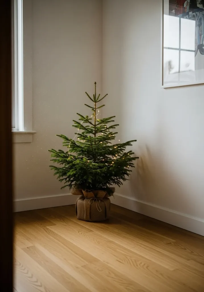 This little tree sits perfectly in its own peaceful corner, wrapped in a cozy burlap base that feels earthy and intentional. Its natural shape, with just a few soft strands of warm fairy lights, makes the space feel calm and uncluttered. The bare white walls and light wood floors keep the focus on the greenery itself, allowing the texture and color of the pine needles to bring life into the room without overwhelming it.