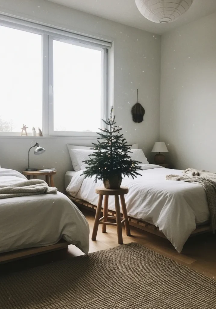 This cozy bedroom captures the charm of minimalist Scandinavian design with its soft neutral tones, simple wooden furniture, and light streaming through a large window. Two low beds dressed in crisp white bedding create a serene, symmetrical balance, while the tiny Christmas tree placed on a wooden stool becomes the room’s understated centerpiece. The natural textures of the woven rug and knitted throw add just the right amount of warmth to the space, making it feel relaxed yet perfectly styled.