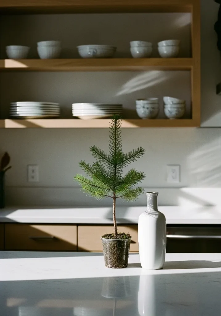 This minimalist kitchen scene feels wonderfully serene with its soft morning light and earthy simplicity. A small potted pine sits gracefully on a clean white countertop, its roots still visible through the clear pot—a sweet reminder of life and growth. Behind it, open wooden shelves hold neatly stacked bowls and plates, creating a calm, functional backdrop that perfectly frames the understated Christmas touch.