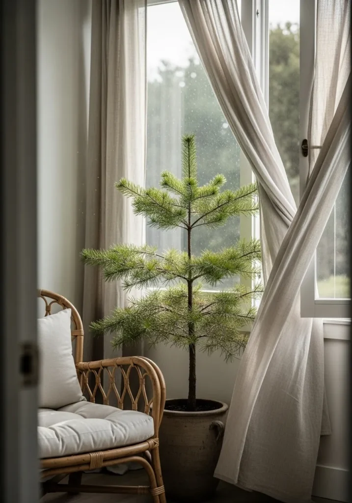 This cozy little nook feels like a quiet exhale. The soft neutral curtains filter daylight onto a slender potted pine, giving it that effortlessly natural charm. The light wicker chair and linen cushions create the perfect pairing for this delicate Christmas tree, letting its simple green branches take center stage. There’s no clutter, no glitter, just calm textures and soft tones blending together in a way that feels grounding and serene.