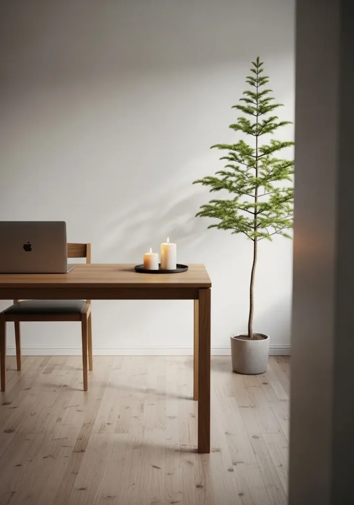 This serene corner captures the essence of minimalist living with its warm wood tones and clean lines. The natural oak table, simple wooden chair, and soft white wall set the stage for a potted evergreen that feels quietly festive without overwhelming the space. The candles on the table add a cozy glow, while the laptop keeps things practical and modern. Everything about this setup whispers calm simplicity, letting natural light and texture take center stage.