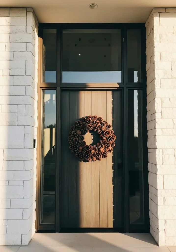 This striking entrance combines white stone pillars with a warm wooden door, and the oversized pinecone wreath steals the spotlight. The natural texture of the wreath pairs beautifully with the sleek lines and glass accents, creating that ideal mix of modern and earthy.