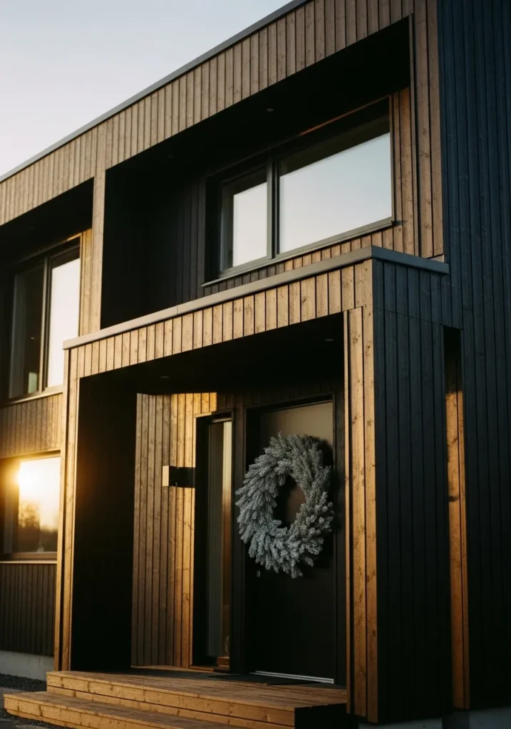 Rich wooden cladding gives this modern home a warm yet bold personality. The frosted wreath on the dark door adds a hint of winter magic, glowing softly in the evening light. Every line of the architecture feels intentional and balanced, making the wreath the perfect finishing touch.