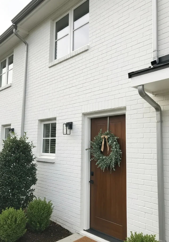 There’s something effortlessly timeless about this white brick home. The light wood door adds a cozy touch against the painted exterior, and the eucalyptus wreath tied with a soft beige ribbon keeps everything calm and natural. The black light fixture and crisp lines pull the look together in that classic, clean way.