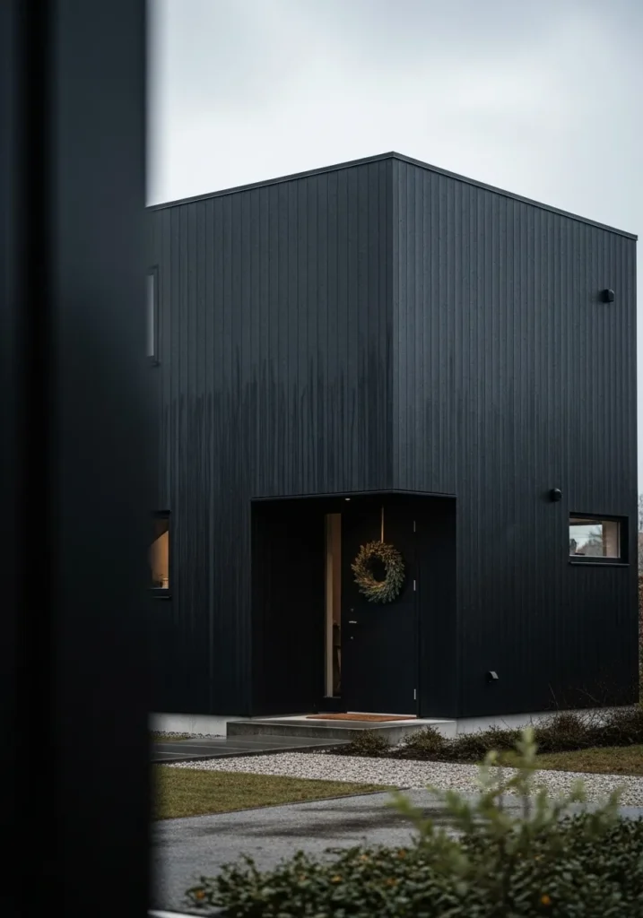 Matte black siding gives this home a bold architectural edge while the recessed entry keeps things sleek and mysterious. The soft lighting draws your eyes straight to the simple evergreen wreath which pops beautifully against the dark door. It’s elegant dramatic and perfectly minimalist.