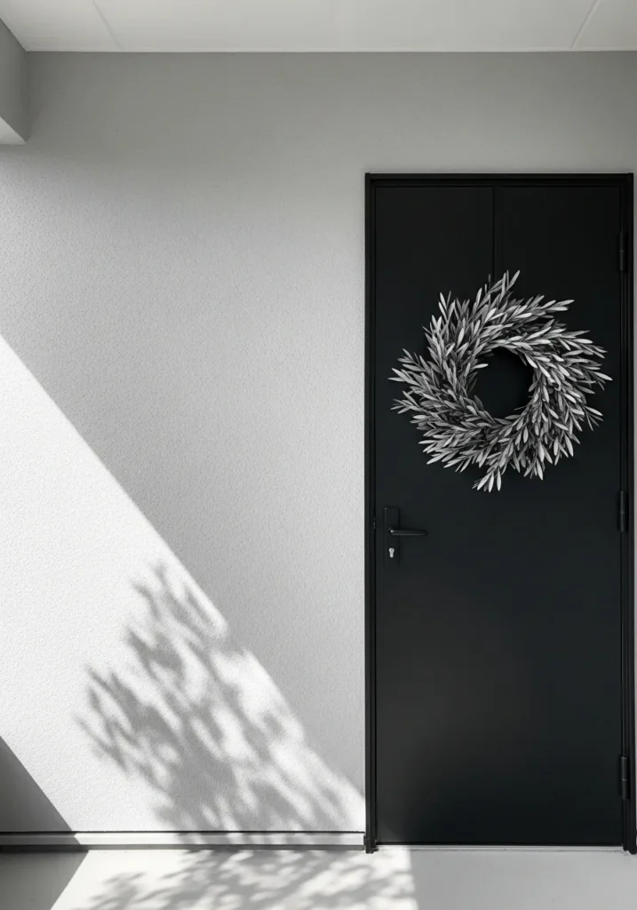 Here, the light does all the decorating. The smooth white wall and matte black door create the most stunning contrast, and the silvery wreath adds just a whisper of holiday sparkle. The soft shadows from nearby trees dance across the surface, making this space feel quietly alive.
