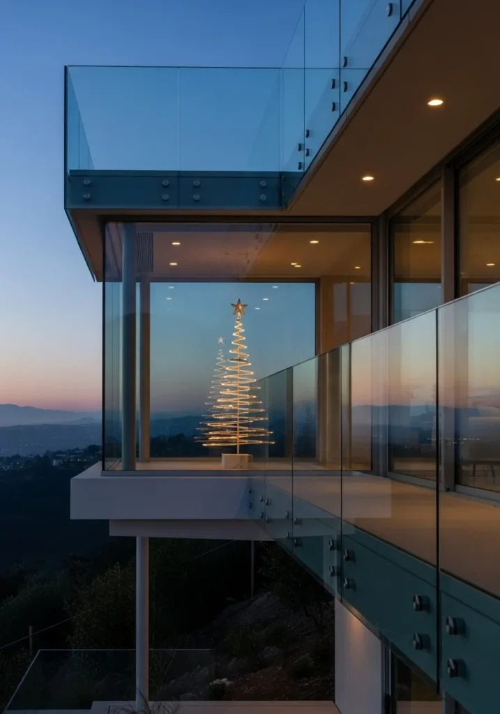 This stunning modern home seems to float above the hills, wrapped entirely in sleek glass and kissed by the evening sky. Inside, a single spiral Christmas tree glows softly, its golden light perfectly mirrored by the transparent walls around it. The clean lines, subtle lighting, and serene mountain backdrop make this house feel like a peaceful retreat rather than just a showpiece. Every inch is designed to celebrate simplicity, balance, and that quiet kind of luxury that speaks in whispers, not shouts.