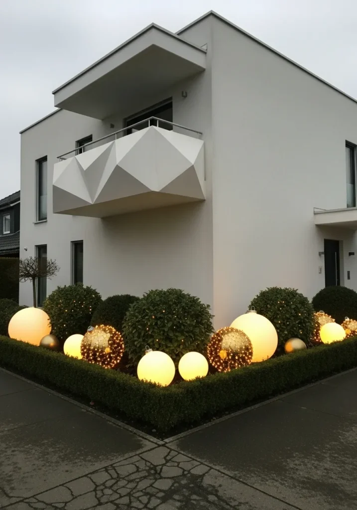 I adore how this setup balances luxury and warmth at the same time. The glowing spheres remind me of snowballs kissed by candlelight, and that soft glow instantly feels festive without being over-the-top. It’s the kind of design that makes me want to pour a glass of wine, slip into something sparkly, and just stand outside admiring how the lights play against the crisp modern lines. It’s calm, it’s classy, and it’s so beautifully put together.
