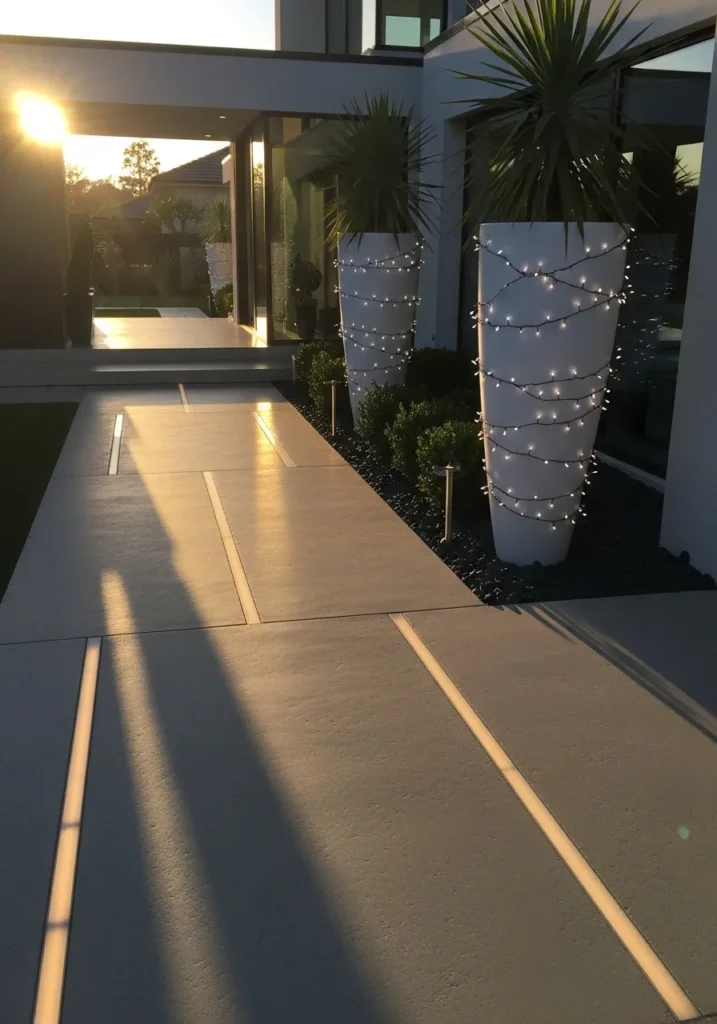 This modern entryway feels like the perfect blend of sleek architecture and soft Christmas magic. The clean lines of the walkway are illuminated with gentle in-ground lights that guide you right to the entrance, while tall white planters wrapped in delicate fairy lights add just the right touch of sparkle. The sunlight bouncing off the smooth concrete gives everything a golden glow that feels warm and sophisticated all at once.