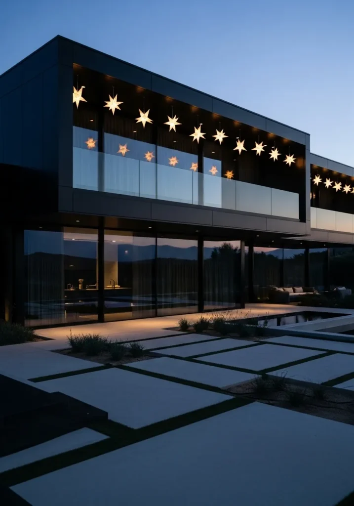 This modern glass house is the ultimate example of understated holiday glamour. Its minimalist architecture features crisp lines, dark reflective panels, and broad windows that mirror the twilight sky. Along the upper level, glowing star-shaped lights add a soft golden warmth that contrasts beautifully with the home’s cool, contemporary exterior. The open layout and subtle garden lighting below create an effortless balance between sophistication and coziness.