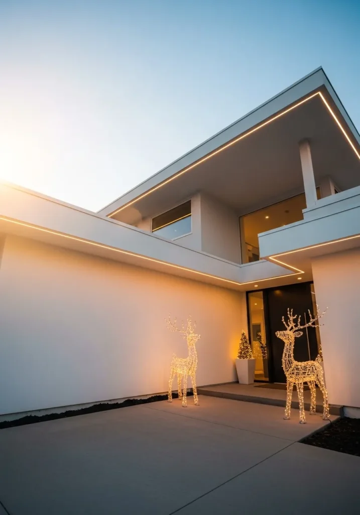 This modern home exterior keeps things effortlessly chic with its clean white architecture and razor-sharp lines outlined by soft, golden strip lights. The lighting follows the structure’s edges perfectly, creating a sleek frame that glows as the sun sets. Two illuminated reindeer sculptures stand at the entrance, giving the space just enough Christmas spirit without taking away from its minimalist sophistication. The simple potted tree near the doorway adds a polished festive touch that feels both modern and welcoming.