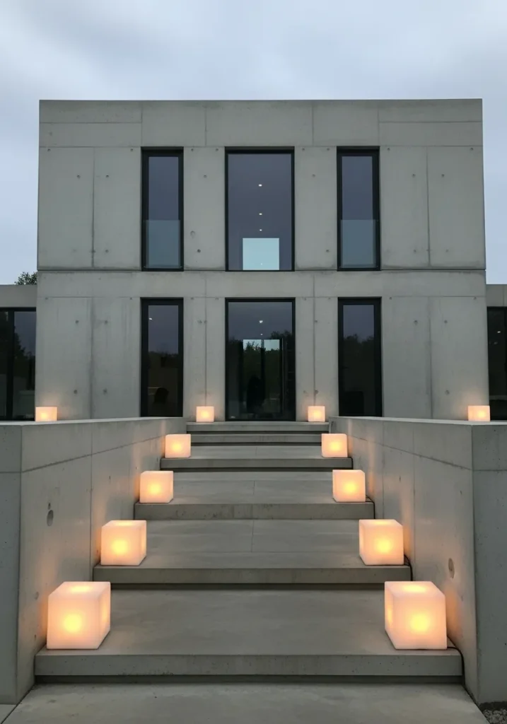 This home captures the heart of modern minimalism with its bold geometry and sleek concrete facade. The clean lines and monochrome palette create a perfect backdrop for the soft, glowing cube lights that guide the way up the steps. Each cube feels like a tiny beacon, balancing the structure’s strong architecture with a gentle touch of warmth. The symmetry, simplicity, and muted tones make the whole space feel like a serene architectural poem.