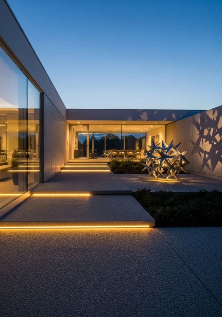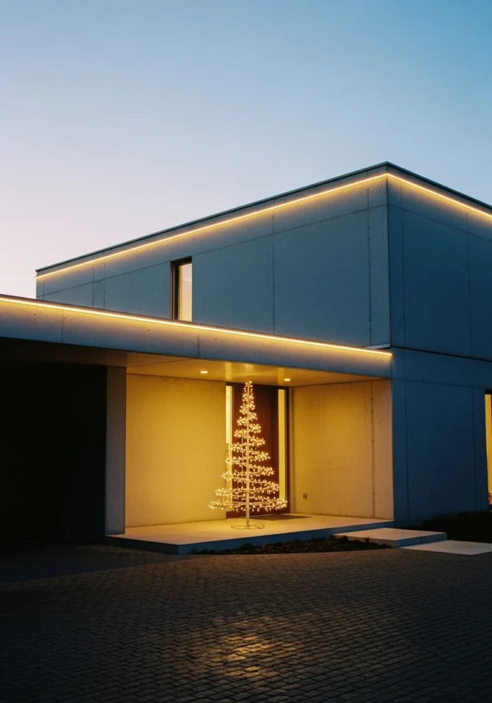 This ultra-modern home exterior features clean lines, floor-to-ceiling glass, and a perfectly balanced mix of concrete and warm light. The walkway is softly illuminated with linear LED strips that trace each step, creating a golden glow that feels both festive and architectural. At the center of the courtyard stands a striking geometric sculpture, its sharp edges casting playful star-shaped shadows across the walls, echoing the Christmas spirit in the most sophisticated way. The open layout inside glows invitingly, blending indoor and outdoor warmth under the evening sky.