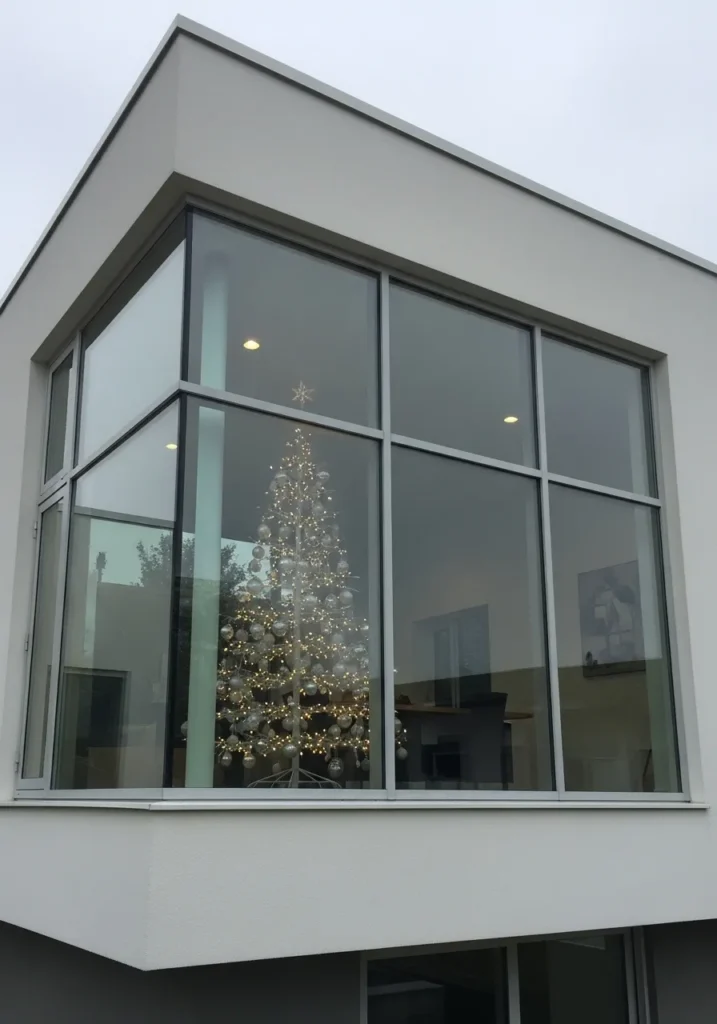 This modern home keeps things wonderfully understated, featuring clean architectural lines and a sleek metal-gray facade. The star of the show is the elegant Christmas light tree glowing softly from the window—a simple wireframe outlined with golden fairy lights, crowned by a single radiant star. The contrast between the building’s cool tones and the tree’s warm sparkle creates a serene, balanced look that feels both festive and effortlessly refined.