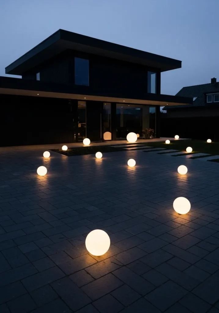 This modern home design plays with minimalism and light in the most magical way. The clean, geometric lines of the dark exterior are perfectly balanced by the soft, round glow of the illuminated spheres scattered across the courtyard. Each orb of light feels like it’s floating on air, creating a serene, futuristic ambiance that’s both welcoming and sleek. The contrast between the dark architecture and the warm lights instantly turns the space into a modern Christmas dreamscape without a single strand of tinsel in sight.