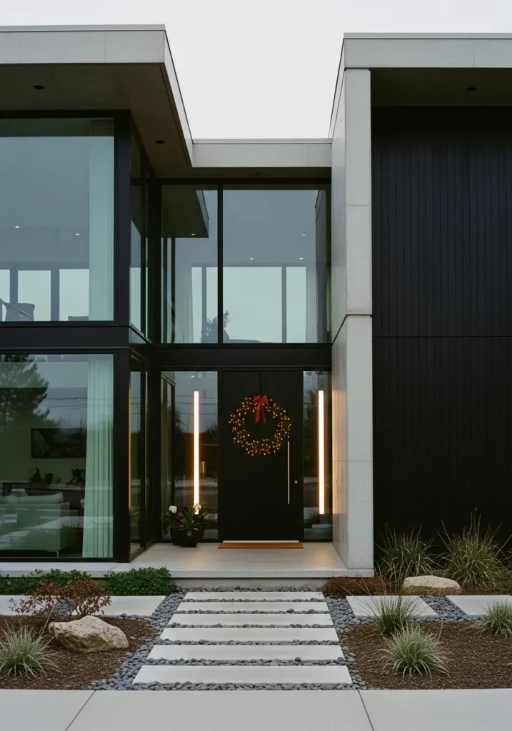 This modern home makes a stunning first impression with its bold geometric lines, tall glass walls, and smooth concrete framing that perfectly balance simplicity and sophistication. The front door, matte black and strikingly tall, features a glowing holiday wreath that adds just the right pop of warmth. Soft golden lighting flanks the entryway, giving the entire space that elegant, architectural glow that feels both high-end and welcoming. The clean stone walkway framed by pebbles and minimal landscaping ties the whole look together for an ultra-chic exterior.