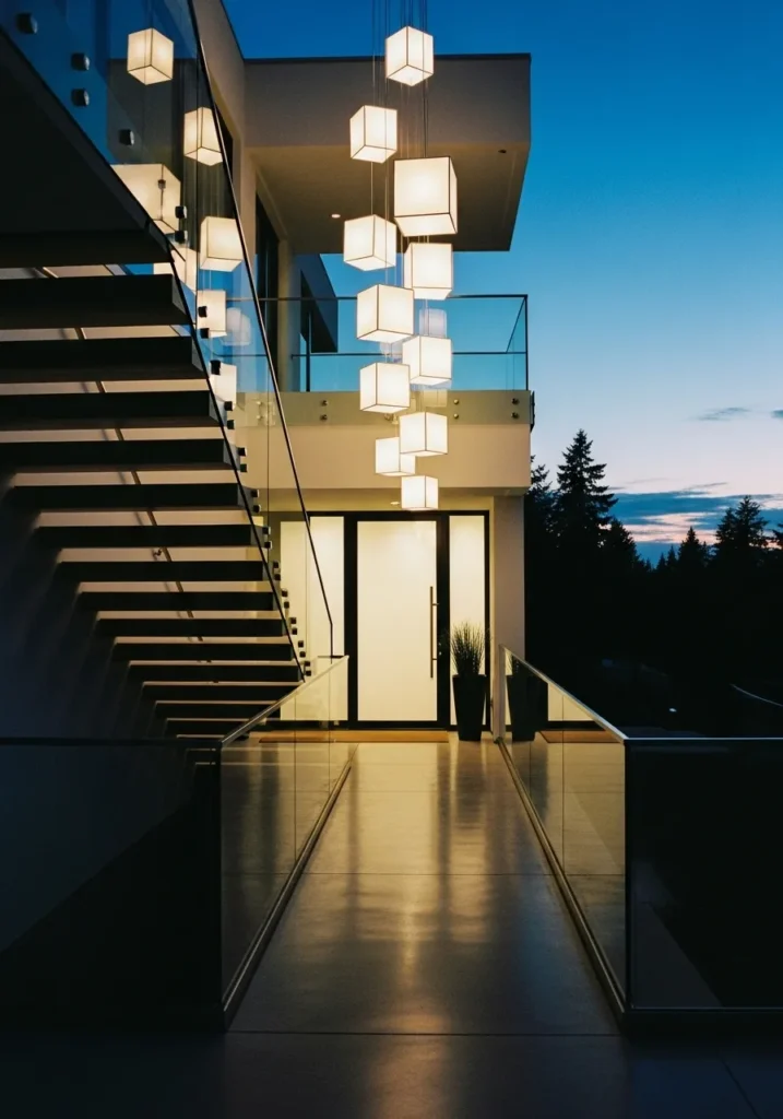 This modern home design feels like walking into an art gallery made of light and glass. The structure’s clean lines and open layout create a seamless flow between indoors and outdoors, with sleek glass railings and a soft minimalist palette. The showstopper, though, is the stunning vertical chandelier of glowing cube pendants cascading from the ceiling—each one perfectly suspended, almost as if floating mid-air. It gives the entrance a sculptural elegance that feels both futuristic and festive, especially against the twilight sky.