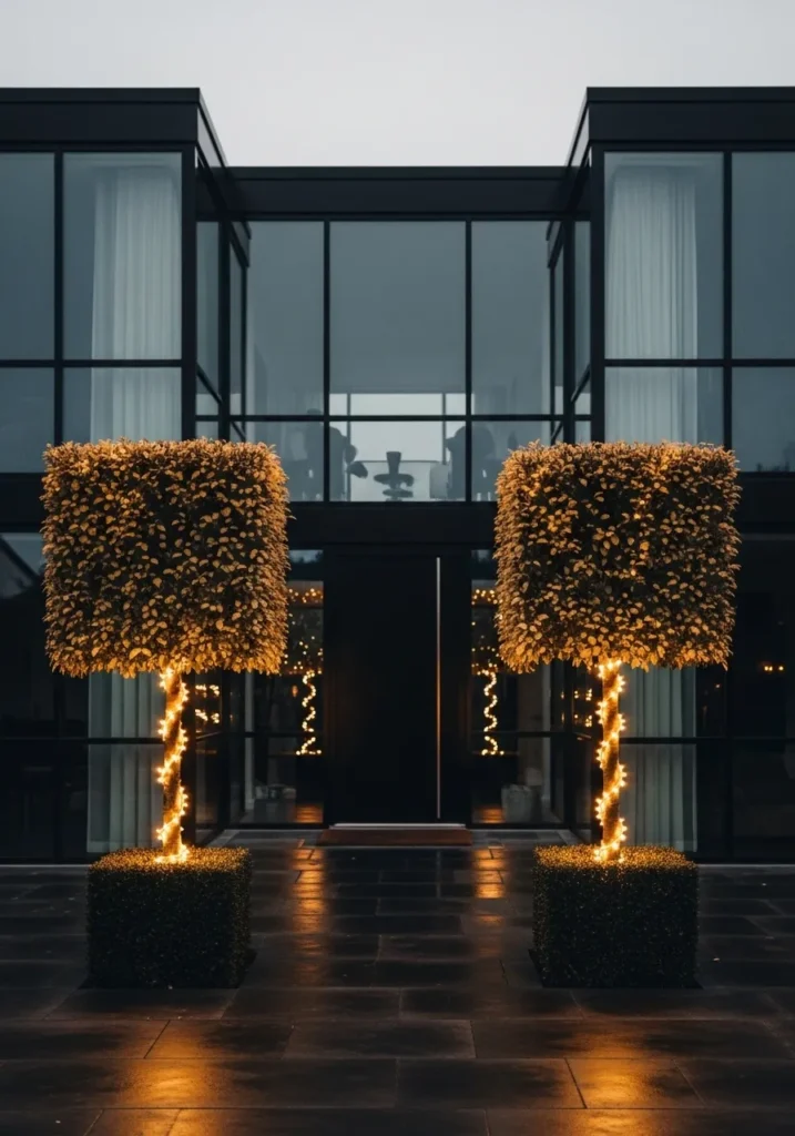 This modern home feels like it was designed straight out of an architectural dream, with its clean glass façade and bold geometric lines. The real charm, though, comes from those two perfectly trimmed topiary trees wrapped in warm white fairy lights. They frame the entrance like elegant sentinels, giving the sleek black-and-glass exterior a soft, golden warmth that feels festive without being flashy. The glossy pavement reflects the twinkle of the lights beautifully, making the whole entryway shimmer in that chic, quiet-luxury kind of way.