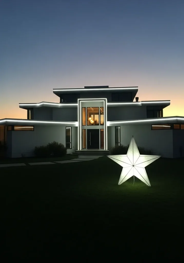 This modern home feels like a masterpiece of geometry meeting holiday cheer. The crisp white exterior is traced with clean LED outlines that emphasize every sharp angle and overhang, creating a futuristic glow that’s equal parts chic and festive. A giant illuminated star rests on the manicured lawn, its soft radiance balancing the structured precision of the architecture. The whole setup glows beautifully against the twilight sky, giving the impression of a luxurious holiday postcard brought to life.
