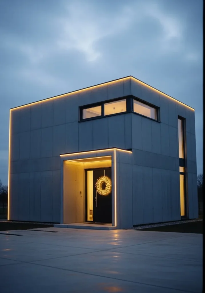 This striking cube-shaped modern home looks like it was plucked straight from an architectural dream. Its smooth concrete exterior is perfectly outlined with warm golden light strips that frame every edge and corner with precision. The lighting continues around the door, highlighting a simple yet elegant glowing wreath that adds a subtle festive charm. With its clean lines, high windows, and minimalist symmetry, this home exudes a quiet sophistication that feels both futuristic and cozy.