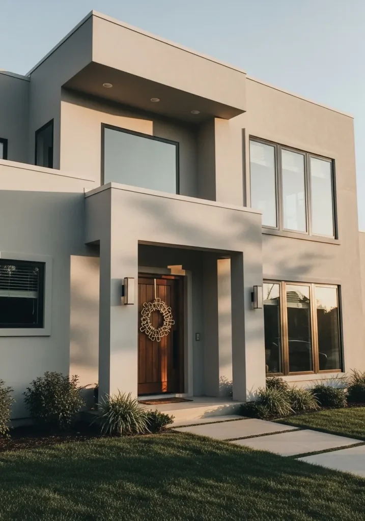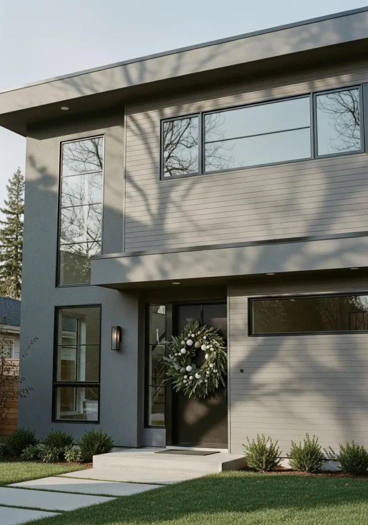 The bold geometry of this house immediately catches the eye, with its crisp stucco walls and large glass windows. The wooden front door adds a touch of warmth, beautifully paired with a gold metallic wreath that glows softly in the afternoon light. The overall look feels sleek but never sterile, like a perfect balance between architectural precision and holiday warmth.