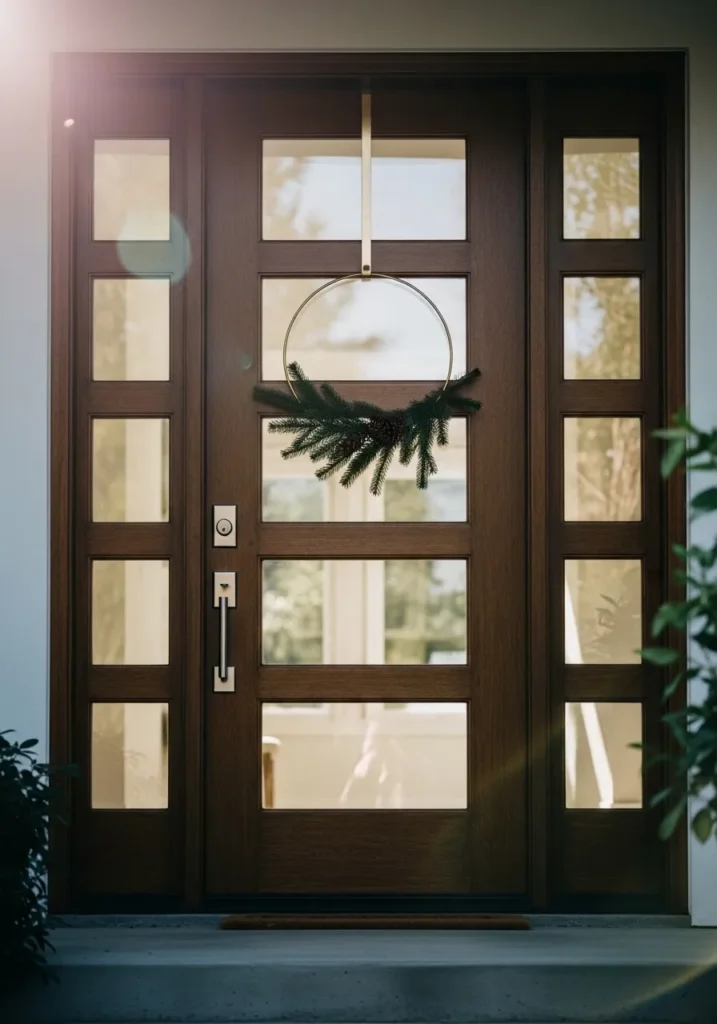 This modern entryway features a cool gray door framed by tall windows, catching the warm light of sunset. The lush green wreath with tiny golden fairy lights brings just the right dose of holiday sparkle while keeping the look sleek and balanced. The vertical lines add a subtle architectural rhythm that feels modern yet homey.
