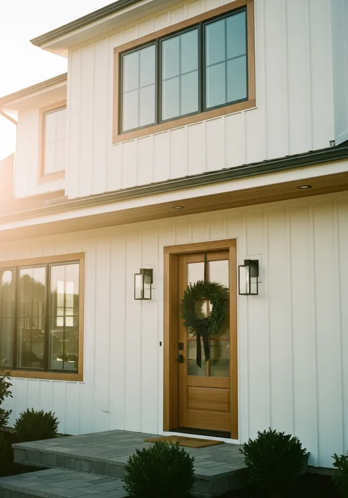 This white farmhouse-inspired home gets a modern twist with sleek black trim and natural wood accents. The classic green wreath tied with a black ribbon is the perfect finishing touch, balancing the clean lines with a cozy, timeless feel. The morning sunlight makes everything glow beautifully.