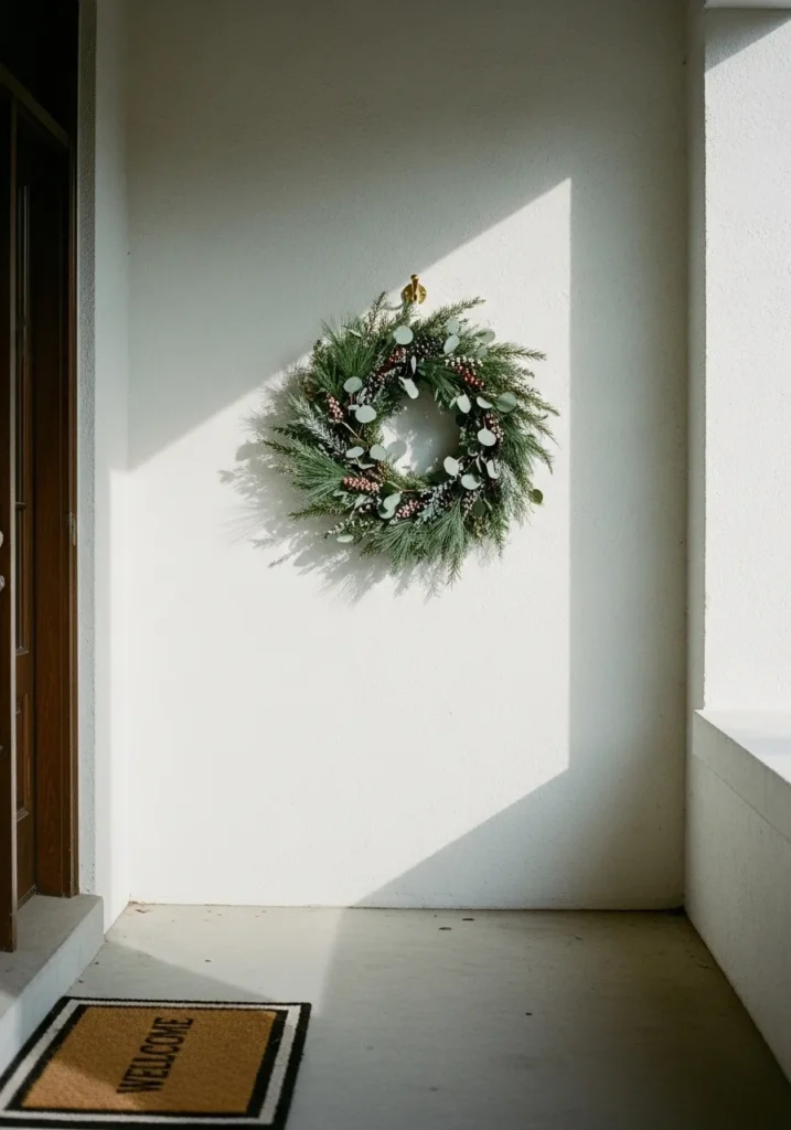 This front porch is a lesson in simple holiday beauty. The clean white wall becomes the perfect backdrop for a lush evergreen wreath dotted with berries and eucalyptus sprigs. The soft sunlight adds a warm glow that makes the whole space feel cheerful and inviting.