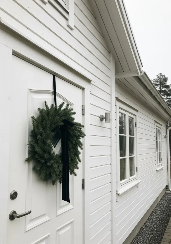 This Scandinavian-inspired home embraces soft white tones and clean horizontal lines. The white door blends seamlessly into the facade, with a lush evergreen wreath hanging from a bold black ribbon that stands out in the best possible way. The whole scene feels calm, natural, and beautifully composed.
