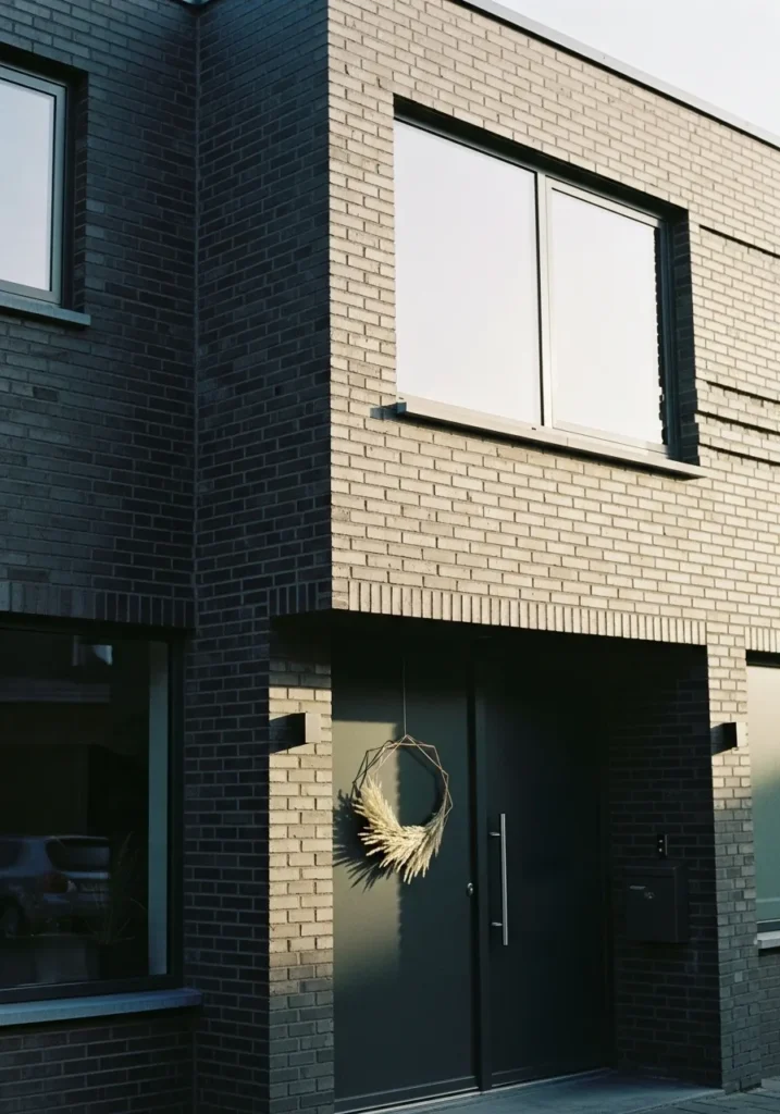 Here we have a deep charcoal brick facade paired with a strikingly modern wreath made of dried pampas and a thin geometric frame. The combination of dark tones and soft natural textures gives the entrance a sophisticated yet earthy vibe. Subtle sunlight adds warmth, highlighting the rich texture of the brickwork.