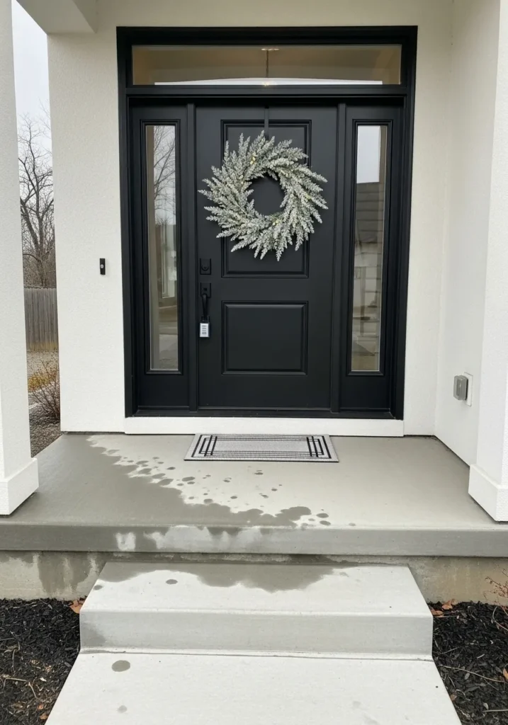 This front entry mixes bold contrast with timeless style. The black door, framed by white walls, instantly feels crisp and polished. A frosted white wreath softens the look with its icy tones, giving off a subtle winter sparkle that complements the sleek exterior.