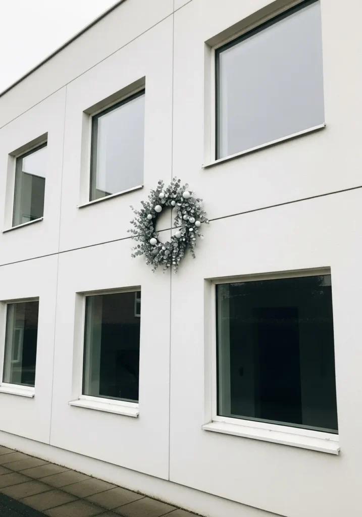 The flat white facade of this home gives off pure minimalist perfection. A large silver-toned wreath made of eucalyptus and white ornaments adds just enough texture to break the symmetry without disrupting the clean design. The subtle matte finish of the walls makes the wreath shimmer gently in the soft daylight.