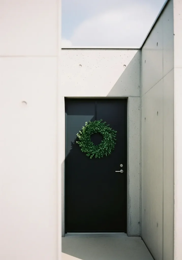 This home has a calm and understated charm, featuring smooth concrete walls that frame a deep black door adorned with a simple green wreath. The clean lines and soft play of natural light create a quiet, modern atmosphere that feels balanced and peaceful. Every element here is deliberate yet effortless, with the fresh greenery bringing life to the muted tones of the concrete.