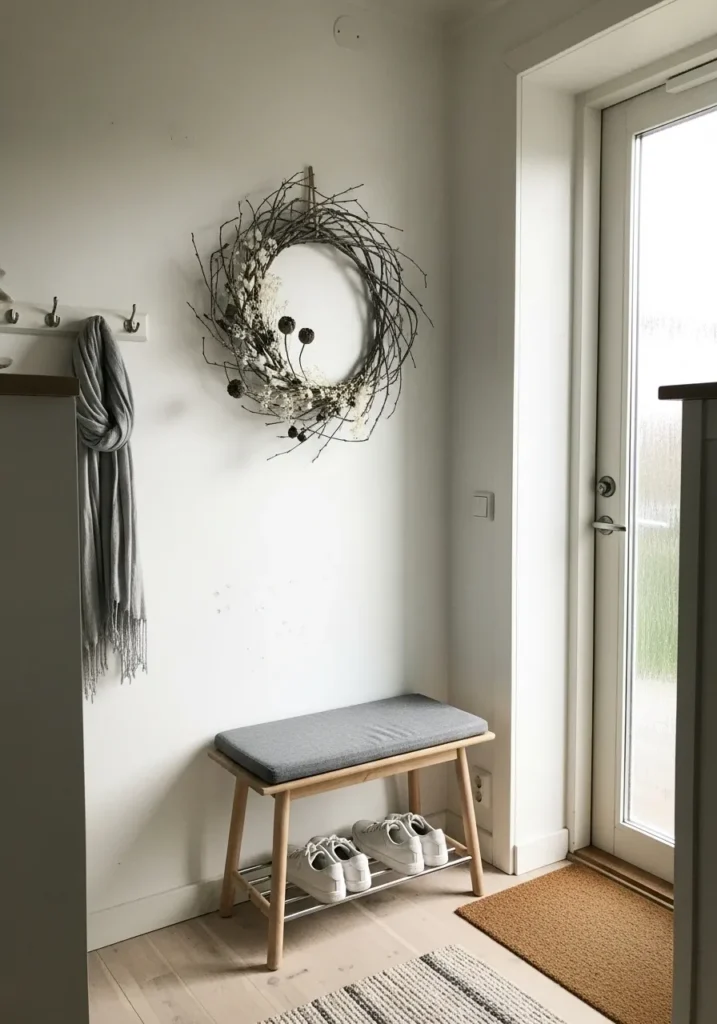 This serene hallway keeps things simple with soft white walls, light wood floors, and a cozy little bench. A twig wreath with dried florals hangs beside the door, adding an understated winter charm without overpowering the space. The design feels effortlessly airy and calm.