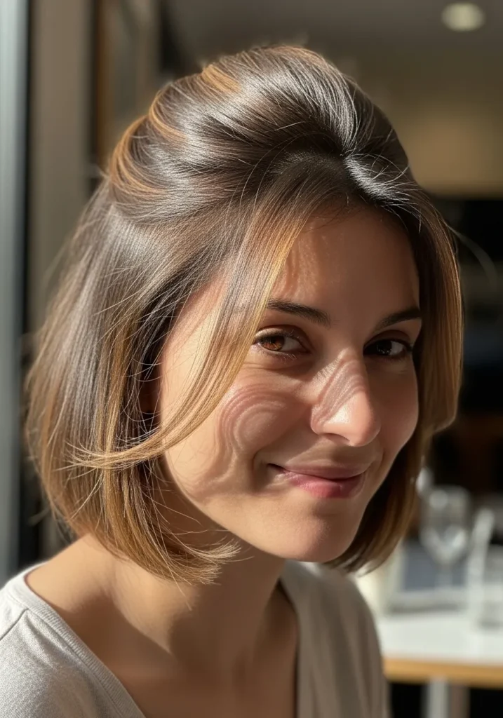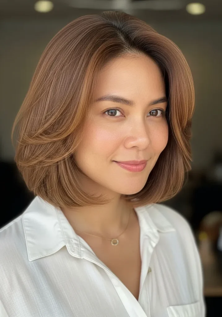This bob has smooth feathering through the sides and a subtle lift at the crown that gives shape without too much height. The warm brown blend creates a soft glow and the ends curve gently under. The style feels clean and modern.