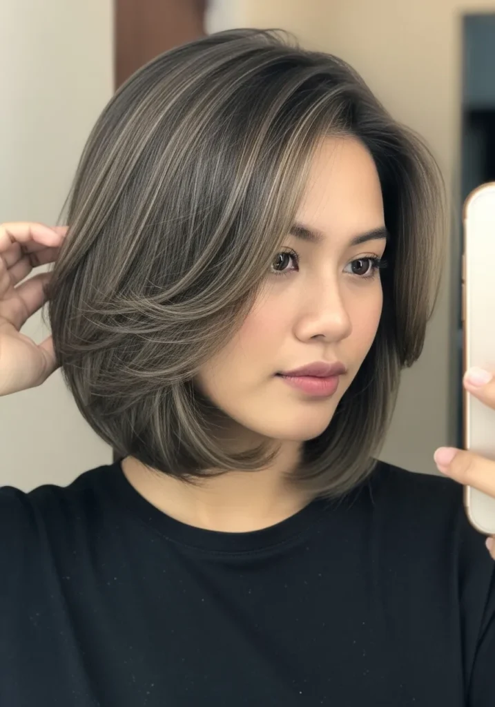 This bob features cool brown and ash toned highlights that create soft dimension through the layers. The feathered cut keeps the ends light and the length sits comfortably at the jawline. The texture stays silky with gentle movement.