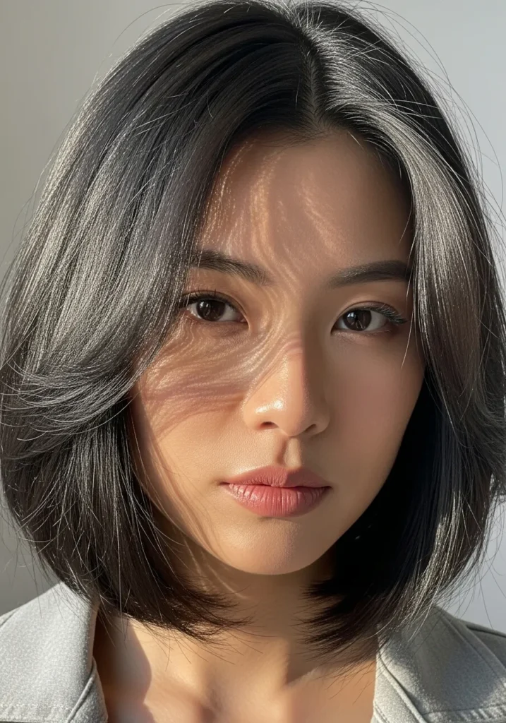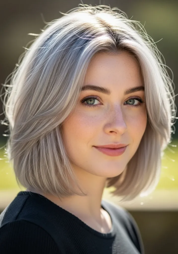 This bob has a silky silver shade that glows in daylight. The feathered layers add gentle movement through the sides and the length stops right above the shoulders for a modern finish. The whole cut feels light and soft.