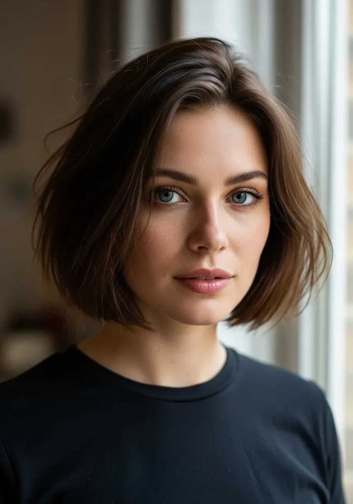 This bob hits just below the jawline with textured feathering that adds soft natural volume. The brunette shade looks rich and the airy layers give the cut a relaxed feel. The ends lift slightly for a gentle curve.