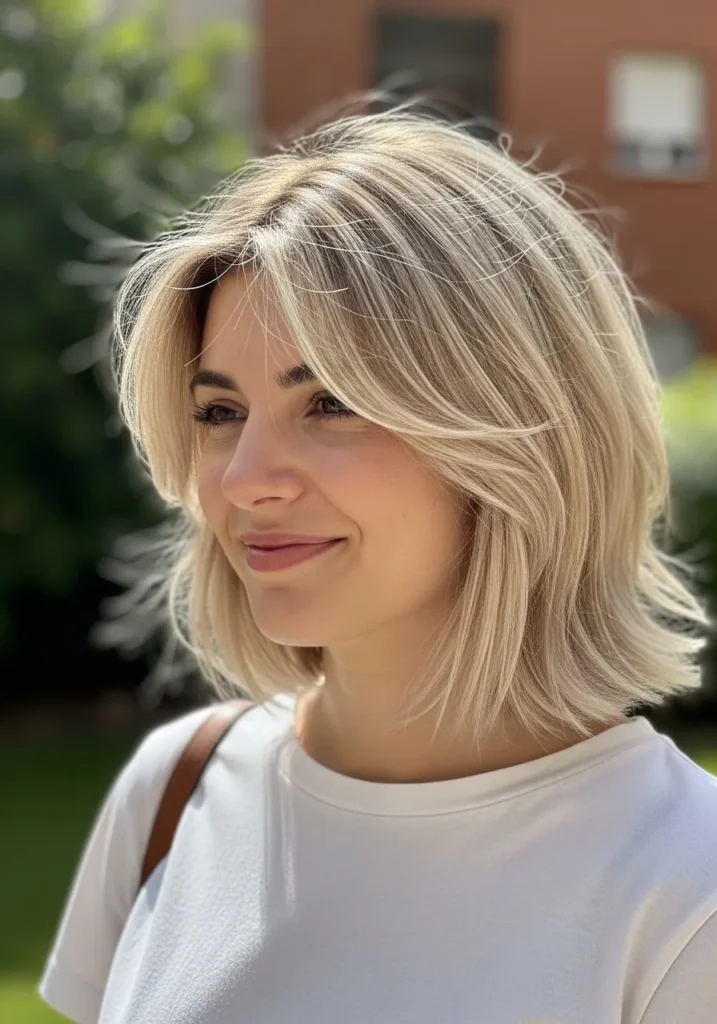 This bob sits at a medium length with soft waves adding a relaxed feel. The golden blonde shade looks even brighter in the sunlight and the feathered ends keep the shape light. The texture feels natural with a little airy bounce.